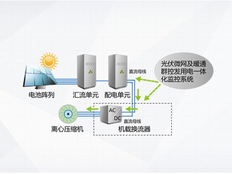 光伏發(fā)電系統(tǒng)不發(fā)電,主機向電網(wǎng)取電運行,機組相當(dāng)于常規(guī)高效變頻離心機。