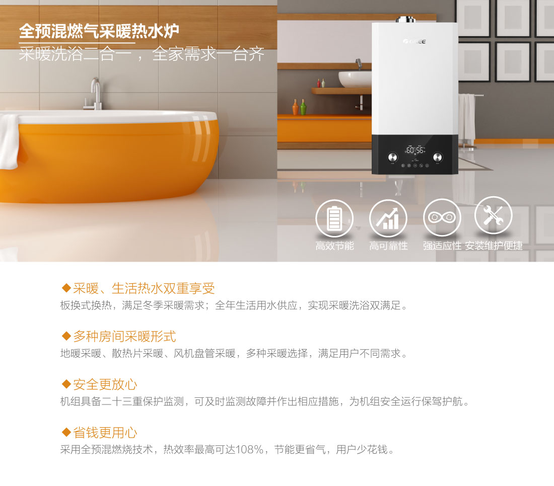 全預混燃燒結合雙寬域功率調節(jié),節(jié)能恒溫,溫差在±0.5℃之間,保證熱水四季恒溫快速出熱水,減少水流浪費,生活水溫度35-60℃,采暖水溫30-80℃